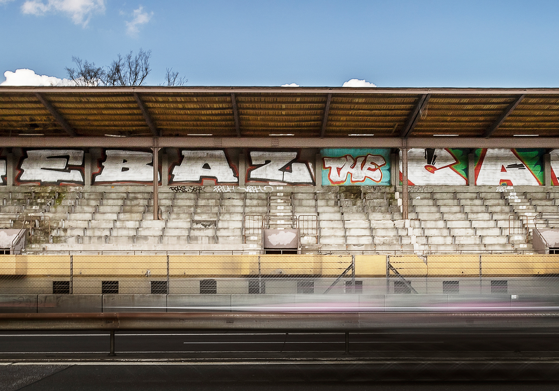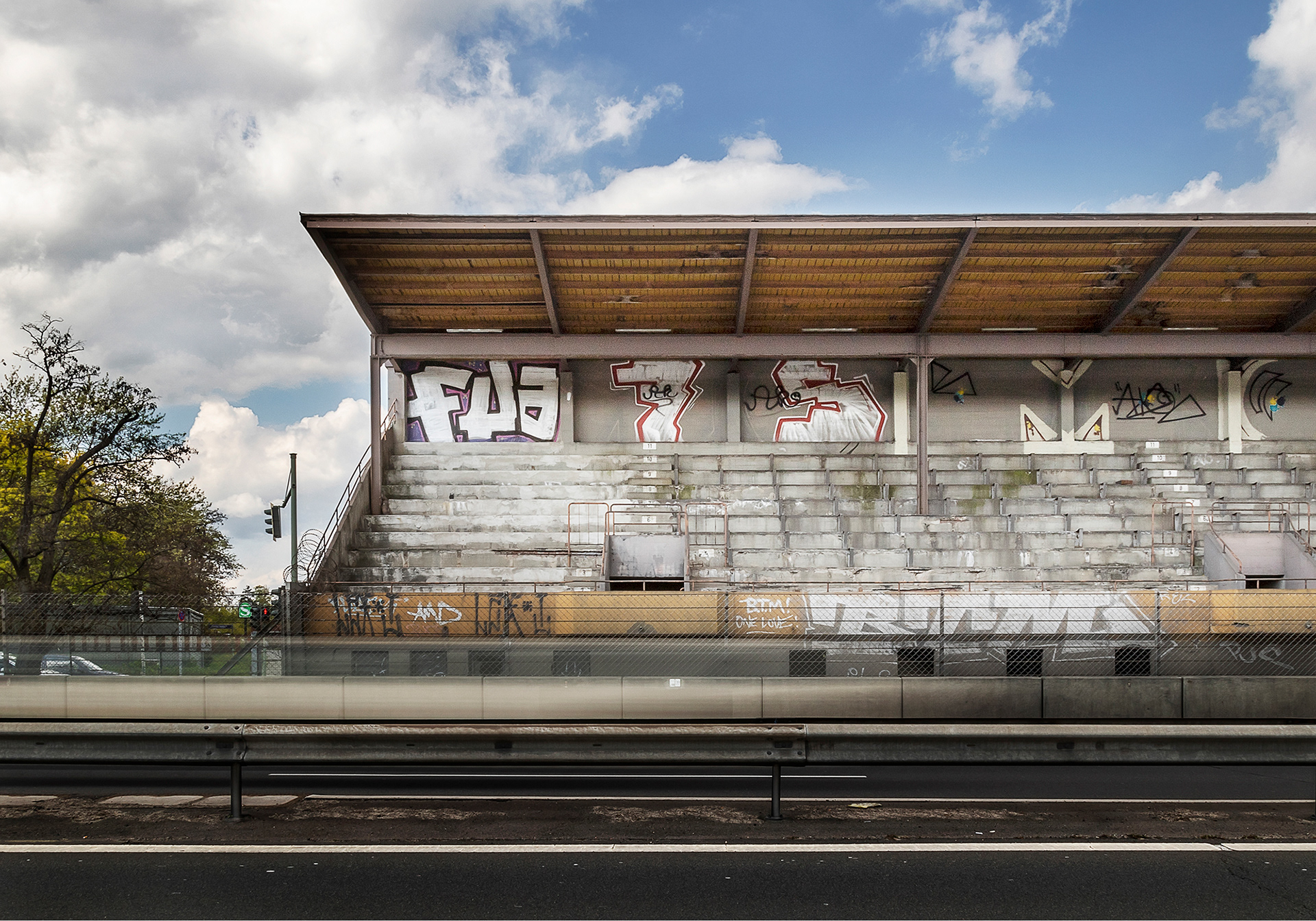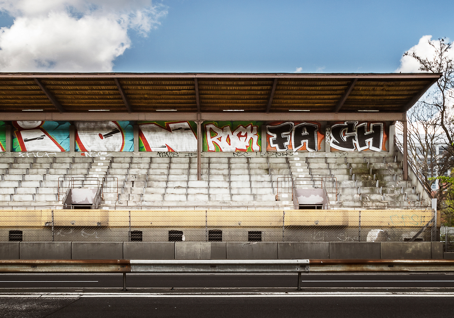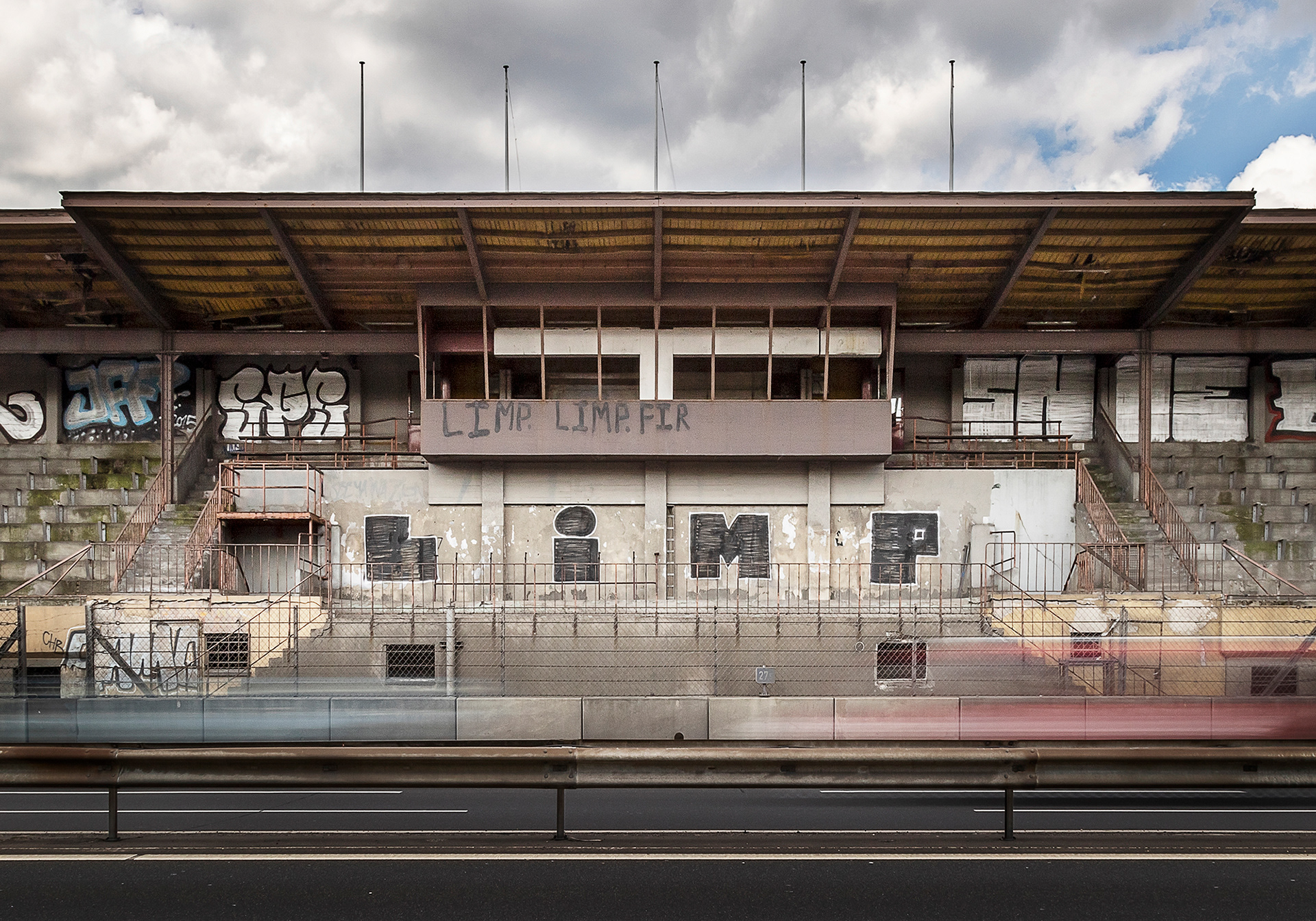 A panorama of the AVUS grandstand in Berlin. Captured in April 2017. Before it has been renovated.