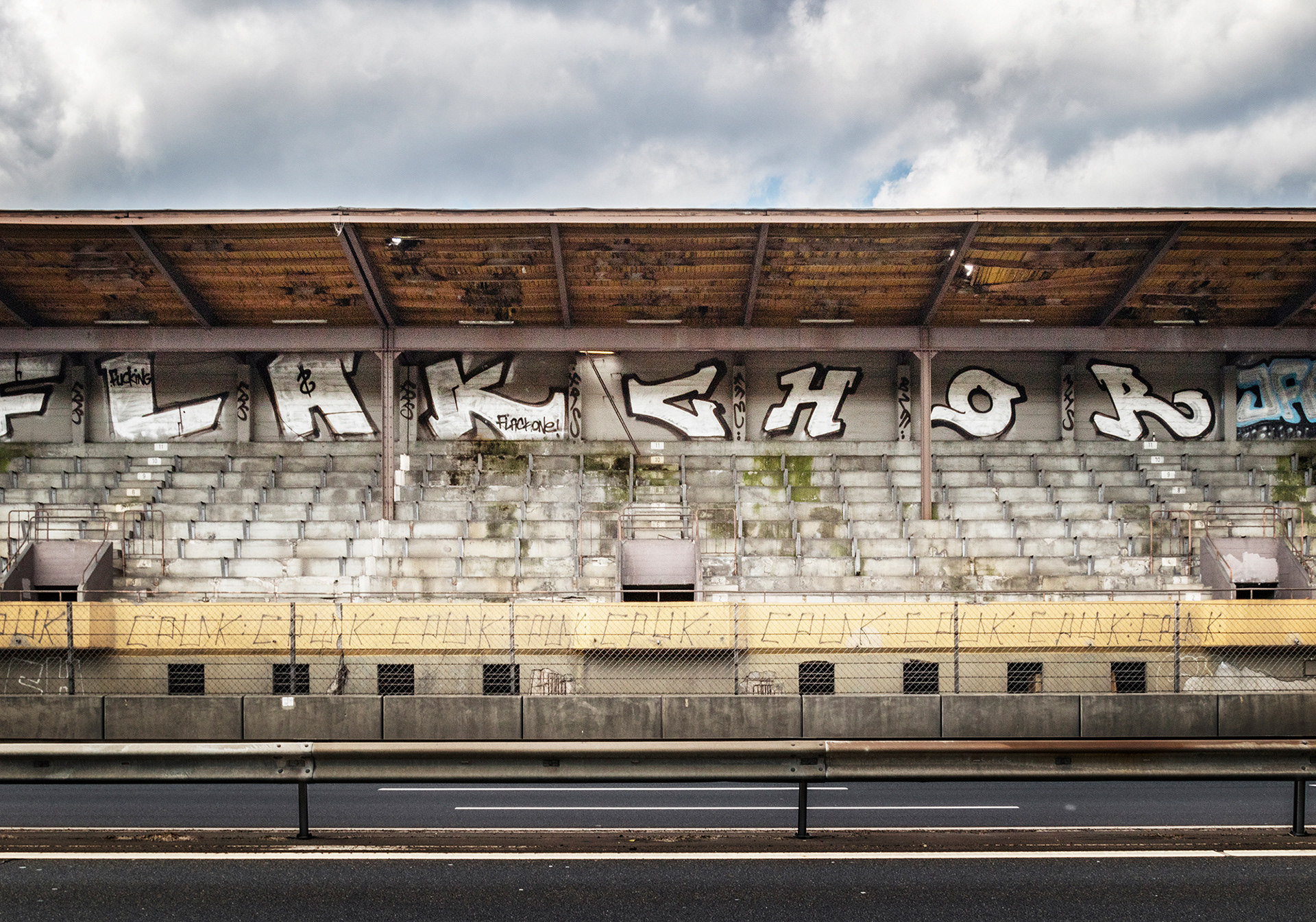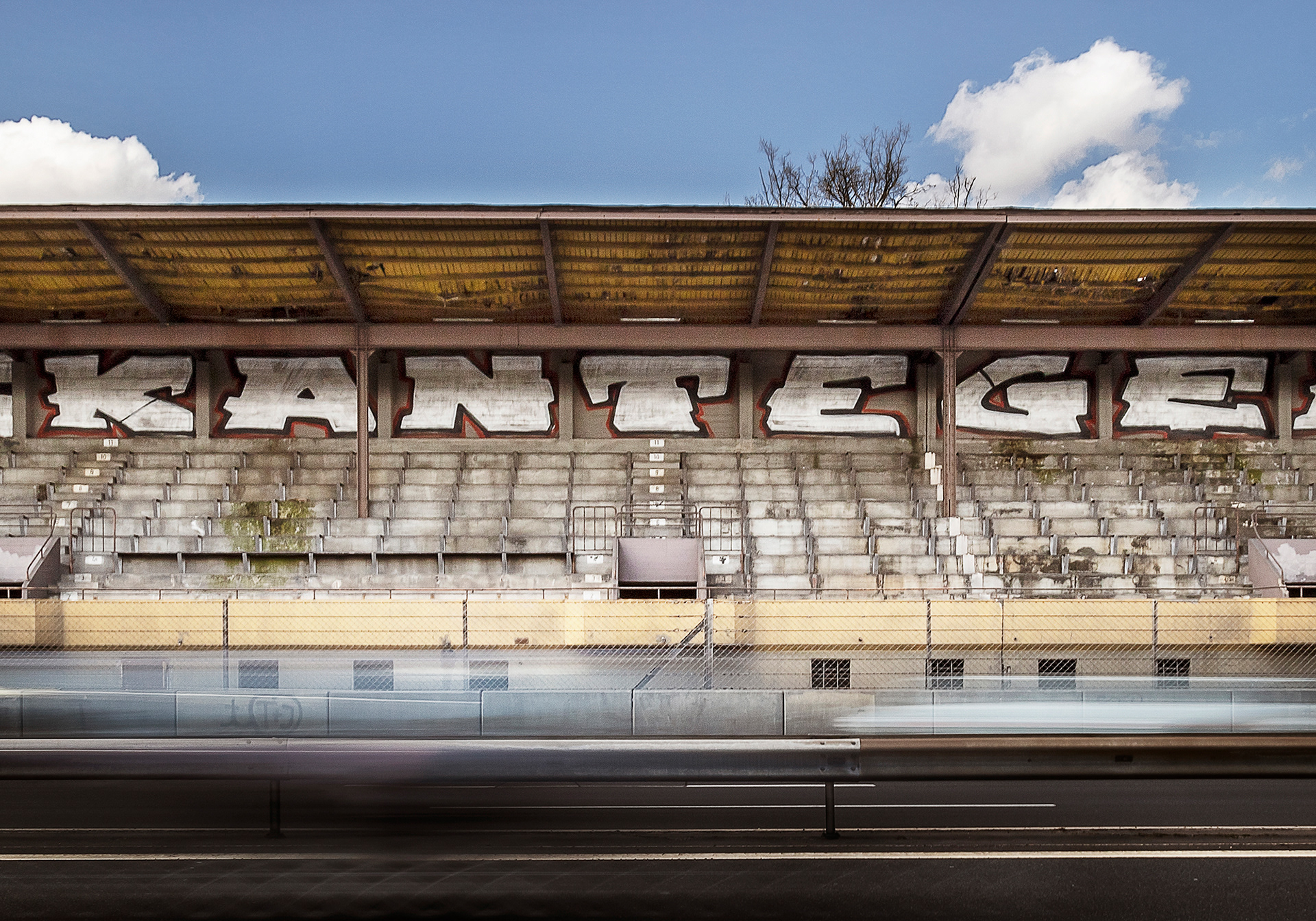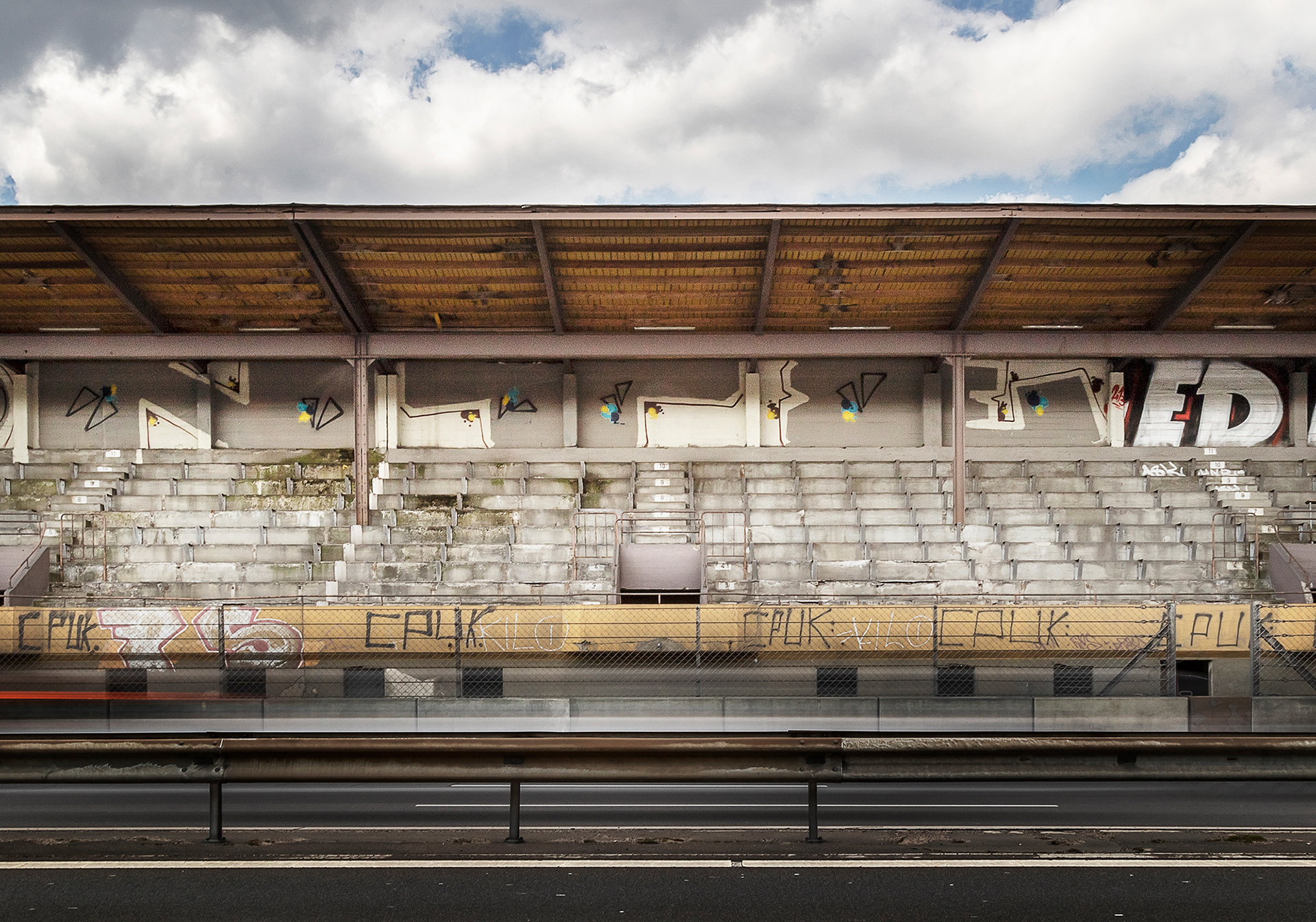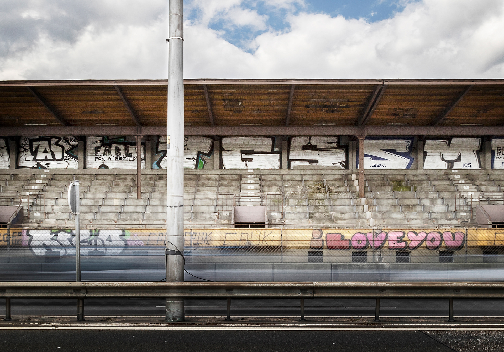 A panorama of the AVUS grandstand in Berlin. Captured in April 2017. Before it has been renovated.